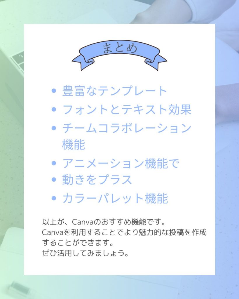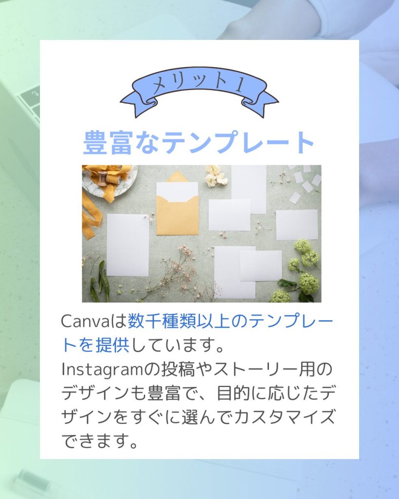 SNS投稿用画像 投稿用画像 2025.04.07 ツールCanva 制作期間2日(テーマはスクールから提供。文章はCanvaにて生成) 概要Canvaの機能を学ぶにあたり、テーマに沿って作成いたしました。見た人が読みやすく、目を引く大きさの文字に青系統で統一した書式にて作成しております。 ターゲットCanvaをこれから学ぶ人。 目的Canvaの機能を知ってもらう。